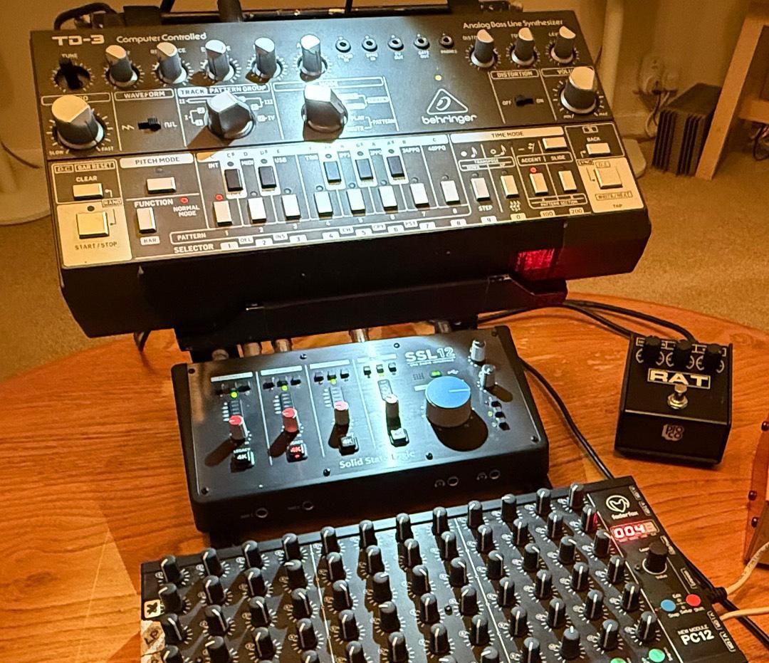 The SSL 12, which he has been using for about a year, operates as a 4-channel mixer for a collection of hardware sound sources. “It's a very sturdy interface and it's proved to be a rock-solid piece of kit for the live show. I was looking for something that was USB powered, that had four ins and outs and had better converters than the previous interface I was using. I tend to play in larger spaces at times, and little details are literally amplified,” he says. As soon as he introduced the SSL 12 into his signal chain, “I noticed straight away a much clearer depth of resolution compared to what I had used before. The preamps for the analogue inputs were clearly superior as well.”