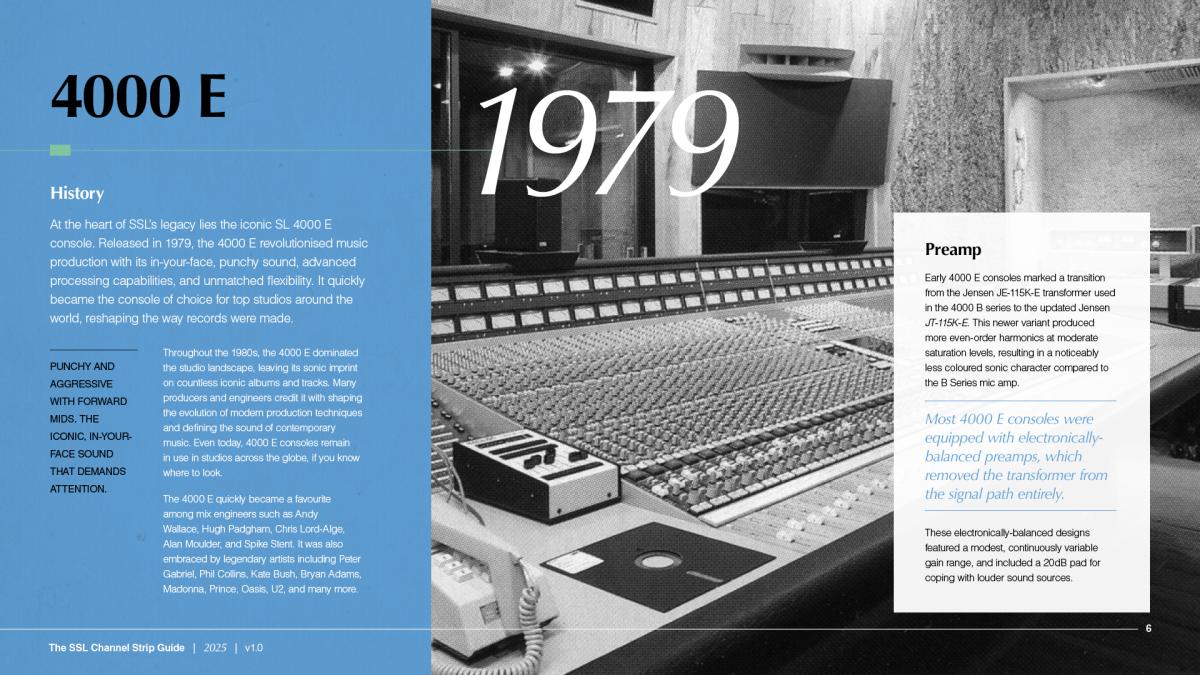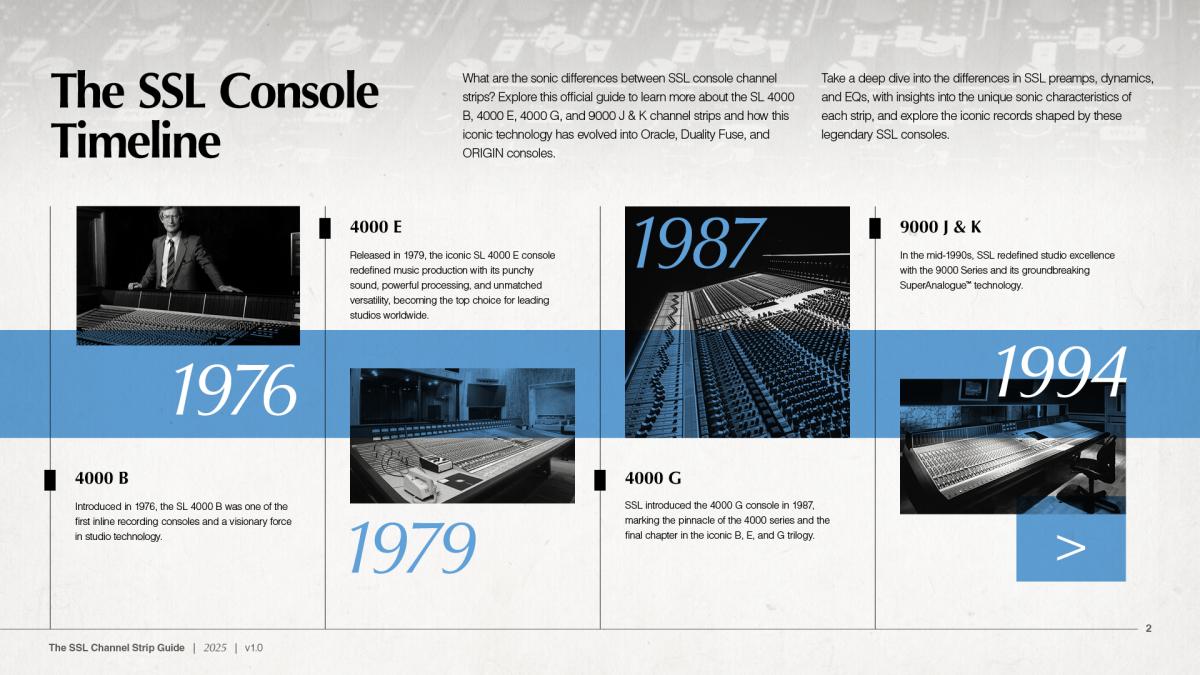 Oxford, UK, November 21, 2025 - Solid State Logic announces the release of The SSL Channel Strip Guide – the first resource of its kind to provide an overview of SSL’s analogue console history in a single document. For over four decades, SSL has pioneered console innovation, creating a lineage of designs each with their own character, technology, and sonic signature. Until now, there has never been a single guide that offers an overview of this heritage. The SSL Channel Strip Guide brings it all together for the very first time, tracing the journey from the groundbreaking 4000 B, E and G Series, through the monumental SuperAnalogue™ 9000 Series, to today’s flagship Duality Fuse and the revolutionary Future Analogue ORACLE, introduced earlier this year. The original 3232 console channel strip is also featured, marking SSL’s ongoing partnership with Nashville-based Harrison Audio.